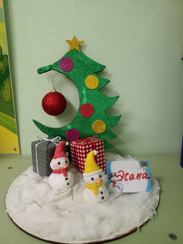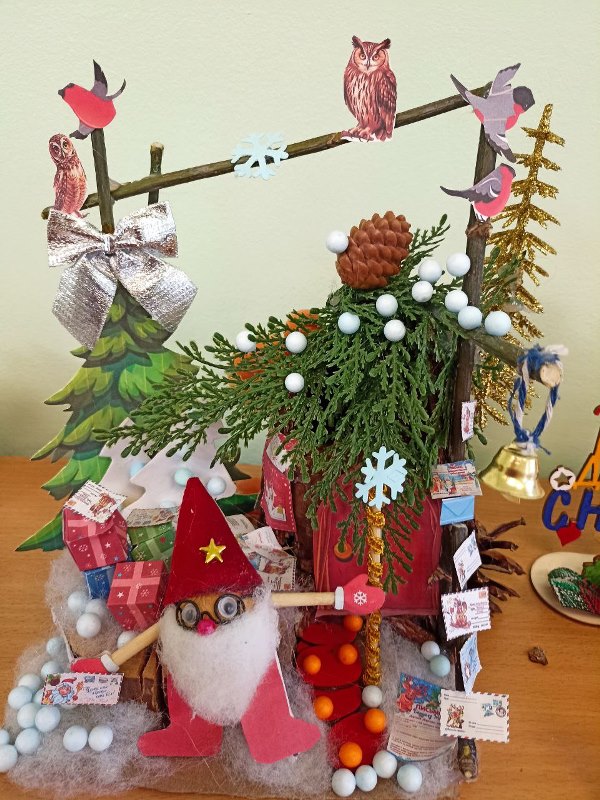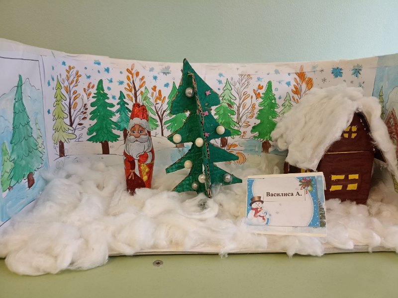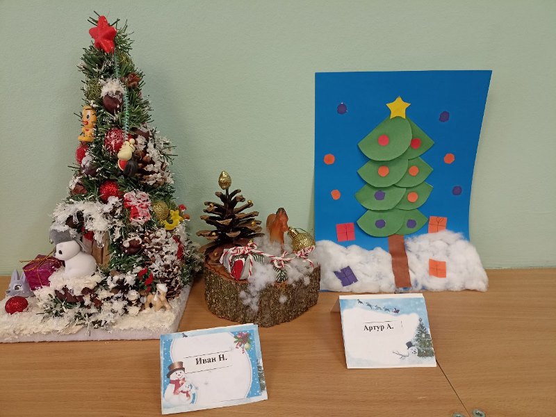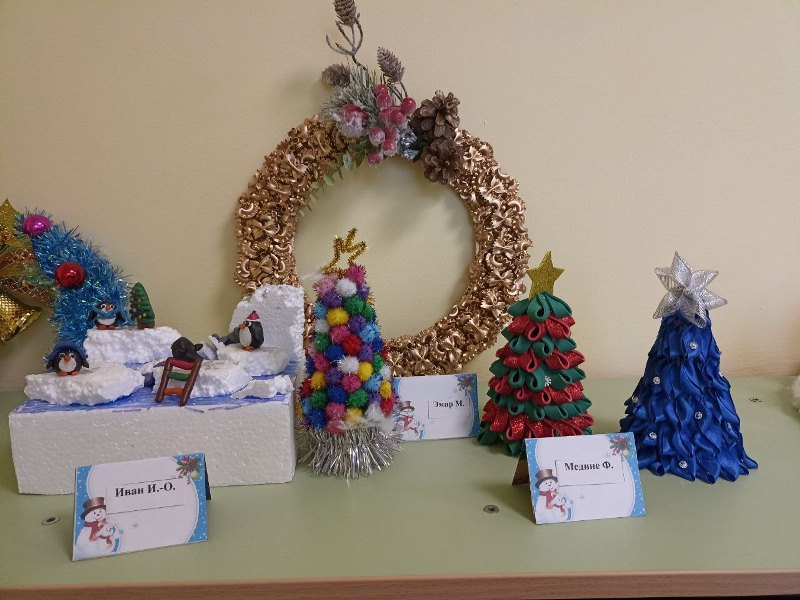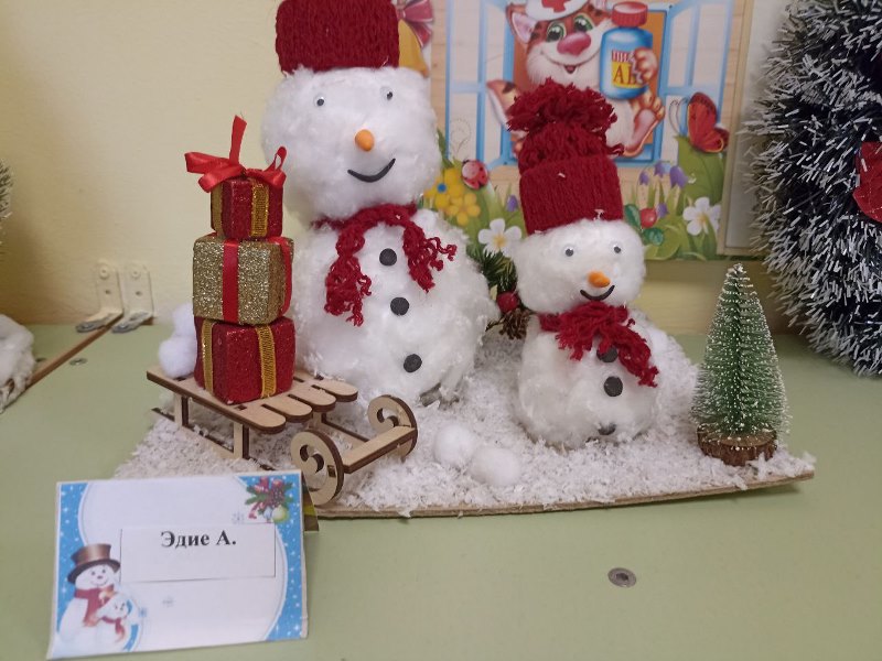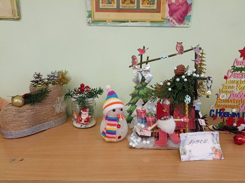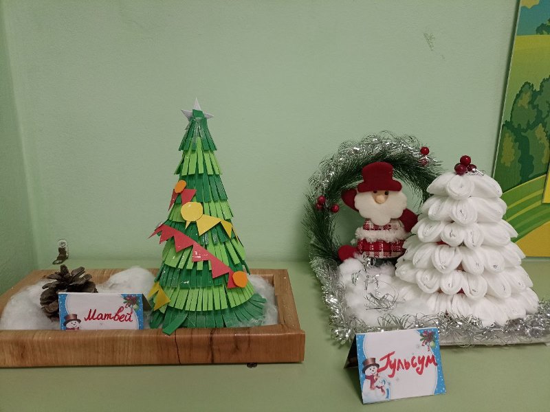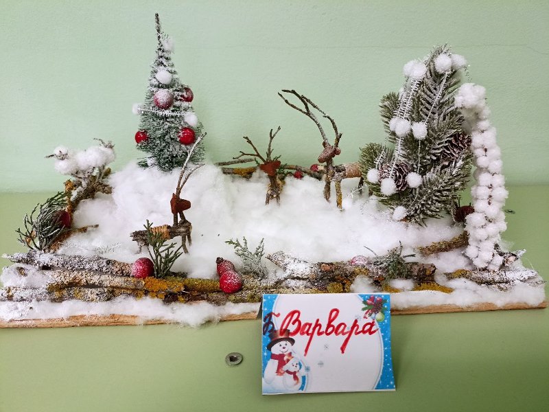 Разнообразные ёлочки, забавные снеговики, заснеженные домики, грациозный белоснежный олень - всё сделано руками детей и родителей.
